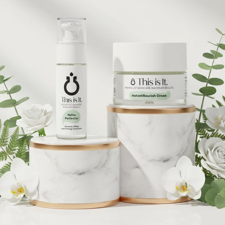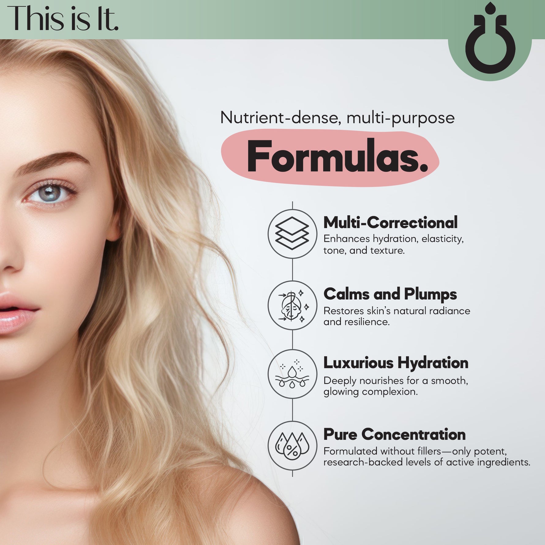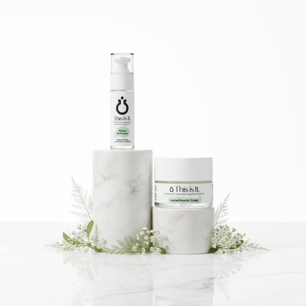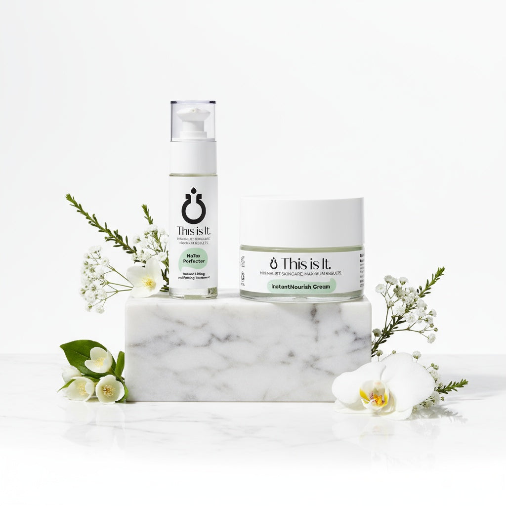 Embrace the serene simplicity of your evening ritual with LiquidReset Serum and the nourishing embrace of InstantNourish Cream. Just a few drops of LiquidReset Serum, followed by a generous application of InstantNourish Cream, envelop your skin in hydration and revitalization, ensuring a peaceful night's rest with This Is It – because skincare should be effortless, even as the day winds down.