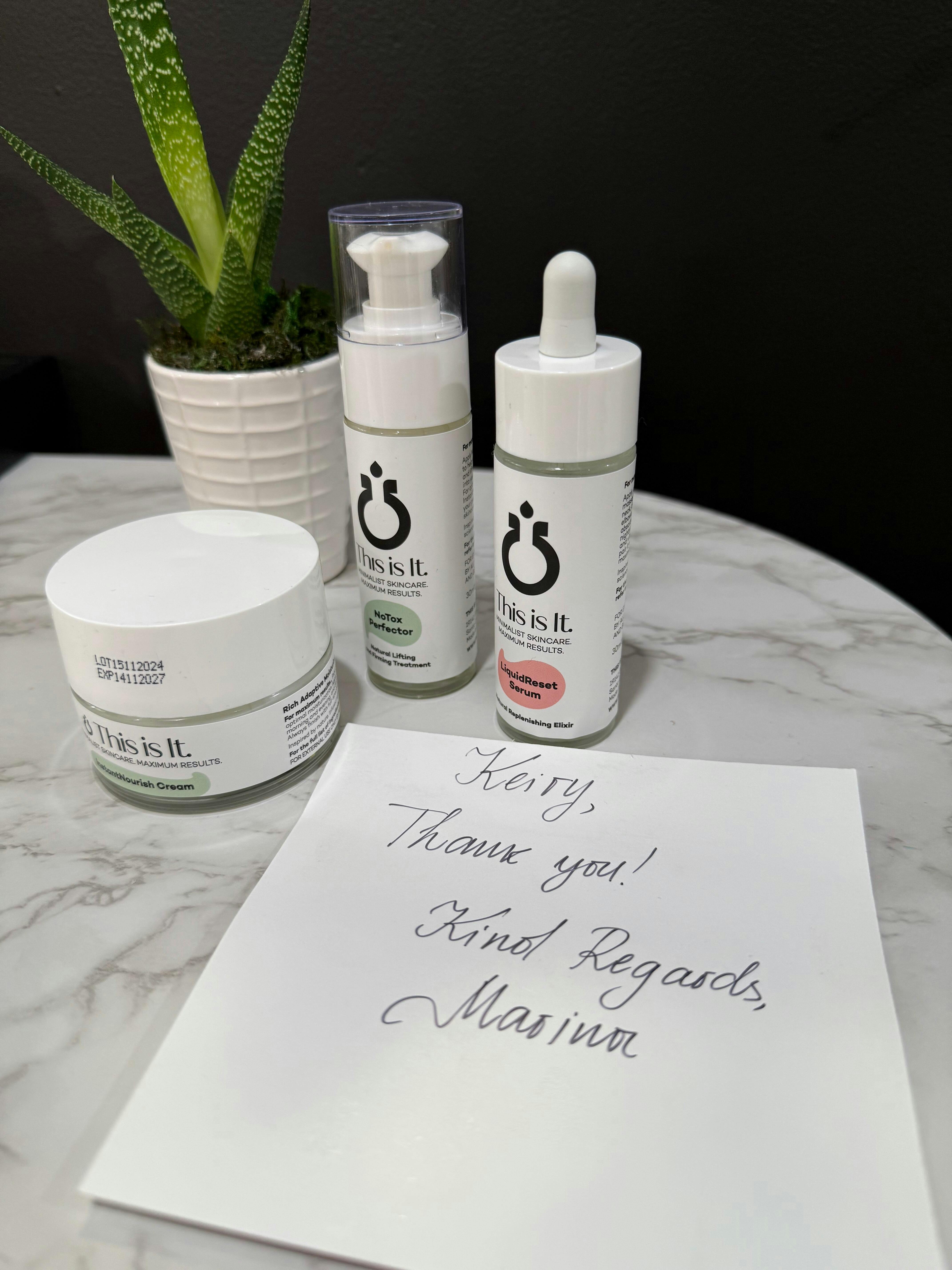 Embrace the serene simplicity of your evening ritual with LiquidReset Serum and the nourishing embrace of InstantNourish Cream. Just a few drops of LiquidReset Serum, followed by a generous application of InstantNourish Cream, envelop your skin in hydration and revitalization, ensuring a peaceful night's rest with This Is It – because skincare should be effortless, even as the day winds down.